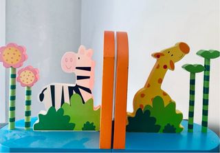 Bonito y práctico sujetalibros en madera de colores que crearà un bonito espacio de hogsr y lectura en el cuarto de los niños.