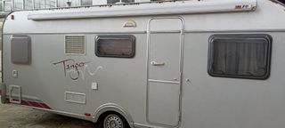Caravana de 6 plazas. Longitud 7,30 con lanza y 2,50 de ancho. DISTRIBUCION. Parte delantera: Cama fija con canapé de 135x190 Parte Central: Comedor convertible en cama, con deposito de agua y termo electrico. Cocina con extractor y fregadero, así como nevera grande con congelador trivalente. Dispone de microondas. Parte trasera: 2 literas de 75x190. La litera inferior se abate y se hace un gran arcón accesible desde el exterior. Al lado está el baño con wáter extraíble desde el exterior, no tiene ducha. EXTRAS. Toldo Fiamma con cerramiento Clip System, estabilizador alko 2004, moverEnduro, calefacción a gas y agua caliente. Sie
