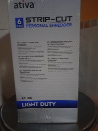Destructora de papel Ativa AT-65, ideal para uso personal. - Capacidad de 6 hojas. - Corte en tiras (Strip-Cut). - Nivel de seguridad DIN P-2. - Capacidad de la papelera indicada. - Apta para triturar tarjetas.