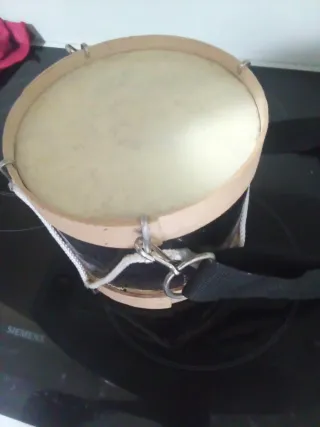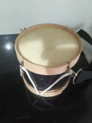 Tambor de juguete con un diseño sencillo y atractivo. - Cuerpo de madera. - Parche de material sintético. - Cuerda para tensar el parche. - Correa ajustable para colgar.