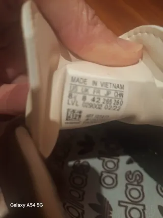 Zapatillas deportivas Adidas fabricadas en Vietnam. - Talla US 8, UK 8, FR 42, JP 265, CHN 260. - Código de modelo: LVL 029002. - Fecha de fabricación: 02/22.