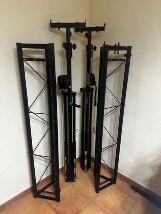 Se vende puente de iluminación profesional, ideal para eventos y espectáculos. Marca AdamHall - Estructura robusta de aluminio y hierro, con cable de acero. - Fácil montaje y desmontaje. - Altura máxima 3 metros -2 patas, 2 trust de 1.5 metros cada uno (total 3 metros), soportes para trust y tornillería para asas de iluminación. palabras clave: iluminación luces dmx led disco móvil discoteca estructura T trípode Global Trust Adamhall barato ganga oportunidad 2024 2025 estrenar sonido rcf Yamaha micrófono mackie Behringer bose