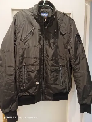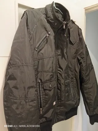 Chaqueta estilo bomber en color negro. Presenta un diseño moderno con múltiples bolsillos y detalles. - Cierre principal de cremallera. - Bolsillos frontales con solapa y cremallera. - Puños y cintura elásticos. - Detalle de parche en manga.
