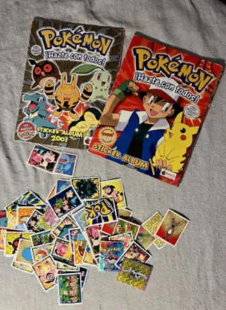 Dos álbumes de Pokémon ¡Hazte con todos! de 2001, uno con portada de Electabuzz y otro con Ash y Pikachu. Incluyen numerosas pegatinas. - Álbum Pokémon ¡Hazte con todos! 2001. - Álbum Pokémon ¡Hazte con todos! (portada Ash y Pikachu). - Incluye pegatinas variadas.