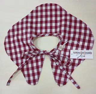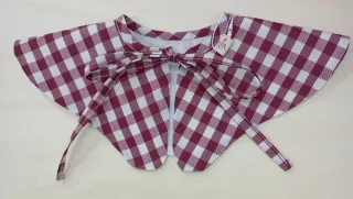 Cuello de tela con un bonito estampado en Vichy en tonos burdeos y blanco. Se cierra con un lazo.