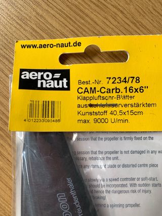 Hélice plegable de la marca aero-naut, modelo CAM-Carb. - Tamaño: 40,5x15cm. - Máximo 9000 RPM.