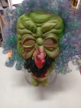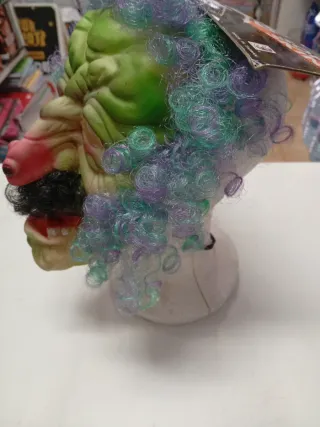 Máscara de carnaval con un diseño llamativo y divertido. Perfecta para fiestas y disfraces. - Color verde con detalles rojos y negros. - Peluca rizada multicolor (morado y verde). - Nariz prominente y barba negra. El elástico hay que cambiarlo