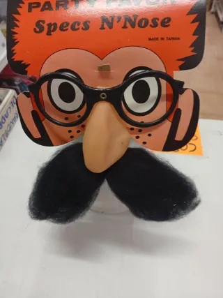 Divertido accesorio para fiestas y carnavales. Combina gafas, nariz y bigote. - Diseño de gafas negras. - Nariz de goma color carne. - Bigote negro. Me quedan 11 unidades cada una vale 1'50