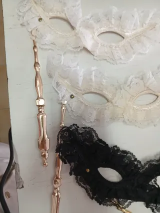 Elegantes antifaces de encaje, perfectos para fiestas o disfraces. Incluyen una varilla para sujetarlos. - Antifaz negro de encaje. - Antifaz blanco de encaje. - Antifaz crema de encaje. - Varilla dorada. 4€ cada una