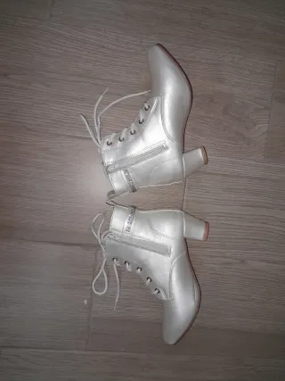 Botas de polipiel en color crudo, con un diseño elegante y detalles brillantes. - Cierre de cordones. - Adorno de pedrería en la tira. - Tacón medio. - Talla 34