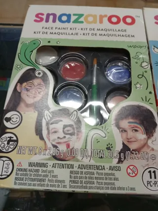 Kit de pintura facial Snazaroo con varios colores y pincel. - Incluye 8 colores de pintura. - Pincel aplicador. - Apto para niños a partir de 3 años.