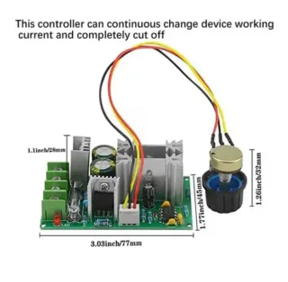 Controlador de velocidad para motores DC con potenciómetro incluido para ajuste fino. - voltaje 12-48 volt.20 amp - Dispone de disipador de calor para una mejor gestión térmica. - Terminales de conexión para alimentación y motor. - Incluye fusible de protección.