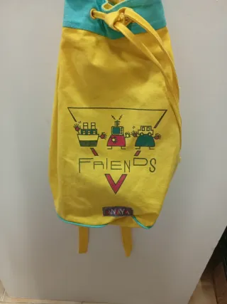 Saco de tela de la marca Anaya, ideal para excursiones. Presenta un diseño divertido con dibujos de robots y la palabra FRIENDS. - Color amarillo. - Ribete y cordones en color turquesa. - Cierre con cordón. - Pequeña etiqueta de la marca en la parte inferior.