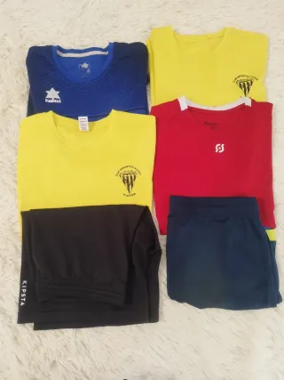 Estupendo lote de 4 camisetas y 2 pantalones deportivos. Talla 12 - Camiseta azul marca Luanvi. - Camiseta amarilla con escudo. - Camiseta roja. - Pantalón negro marca Kipsta. - Pantalón azul.