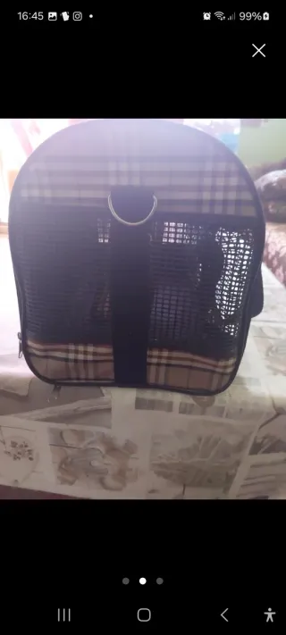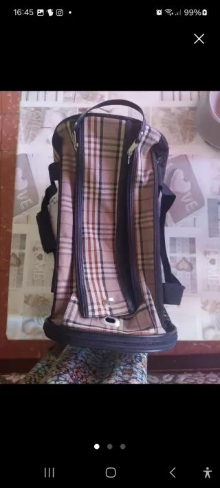 Transportín de tela con estampado de cuadros, ideal para gatos y perros pequeños. Cuenta con asas para facilitar su transporte. - Estampado de cuadros - Asas de transporte