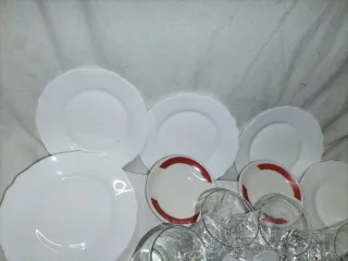 Conjunto de vajilla y cristalería de vidrio. - Incluye varios platos blancos. - Variedad de copas de cristal tallado. - Algunas copas tienen detalles en rojo.