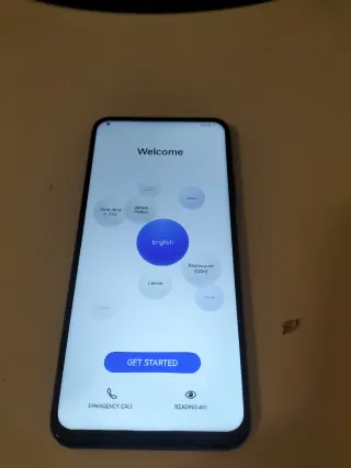 Teléfono móvil con pantalla de bienvenida y opciones de idioma. - Botón GET STARTED para iniciar la configuración. - Opciones de EMERGENCY CALL y READING AID en la parte inferior.