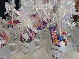 Se hacen detalles para celebraciones, ideales para comuniones, bautizos o bodas. Las bolsitas están decoradas con mucho cariño y contienen una variedad de dulces. Algunas vienen en botellas de plástico transparentes decoradas con lazos de yute y otras en tazas de cerámica con motivos florales. ¡Perfectos para sorprender a tus invitados! - bolsitas de plástico con dulces. - tazas de cerámica con dulces. - Decoradas con lazos y etiquetas. - Cualquier duda o otro tipo de detalles no duden en consultarnos