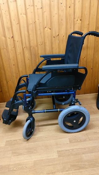 Silla de ruedas manual, plegable, no autopropulsable. Reposabrazos desmontables y abatibles. Reposapiés abatibles y regulables. Cojín antiulceras de regalo.