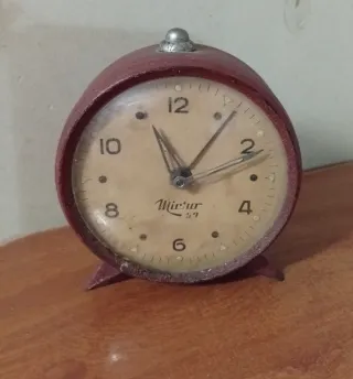 Despertador vintage de la marca Micro, modelo 57. Un objeto decorativo con un diseño clásico. - Cuerpo metálico de color granate. - Esfera con números arábigos. - Agujas de hora y minutero.
