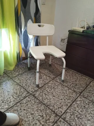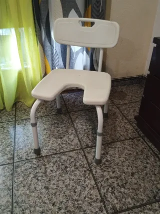 Silla diseñada para facilitar el acceso a la ducha. Su forma permite una mayor comodidad. - Asiento con forma de U. - Estructura blanca. - Patas ajustables en altura.