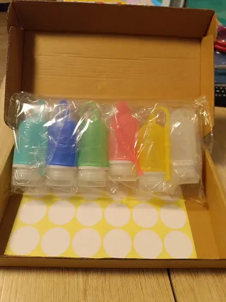 Set de seis botellas pequeñas de viaje, ideales para llevar tus líquidos de forma organizada. - Botellas de colores surtidos. - Tapas seguras para evitar derrames. - Incluye pegatinas para etiquetar.