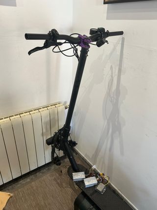 Chasis de patinete eléctrico xiaomi pro 2 modificado. Solo viene el chasis sin nada mas, con doble suspensión monorim manillar fe bici y con la suspensión de adelante adaptada para poner discos de freno de 160mm solo incluye las luces delantera y trasera Sin batería Sin frenos Sin motores Sin extenor Sin electronica Solo chasis con todo adaptado