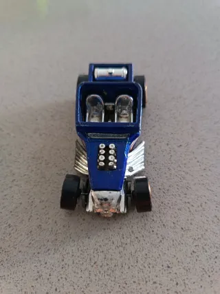 Coche de juguete Hot Wheels Bone Shaker. Eje delantero un poco torcido - Color azul metálico. - Diseño de hot rod. - Ruedas negras con detalles naranjas. - Asientos plateados.