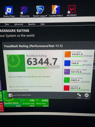 Resultados de PassMark PerformanceTest 11.1 - PassMark Rating: 6344.7 (59th Percentile) - CPU Mark: 14167.9 (53rd Percentile) - 2D Graphics Mark: 749.6 (59th Percentile) - 3D Graphics Mark: 10119.8 (55th Percentile) - Memory Mark: 2402.4 (36th Percentile) - Disk Mark: 20311.9 (71st Percentile)