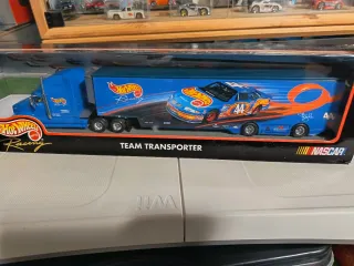 Camión transportador de equipo Hot Wheels Racing. Nascar - Diseño azul con gráficos de carreras. - Incluye un coche de carreras Hot Wheels. - Escala 1:64.