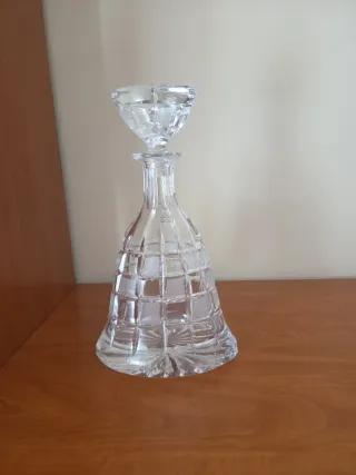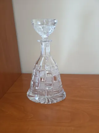 Elegante botella de cristal con un diseño tallado. - Material: Cristal. - Diseño: Cuadros y detalles tallados. - Tapón: Incluye tapón de cristal a juego.