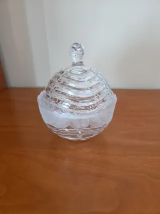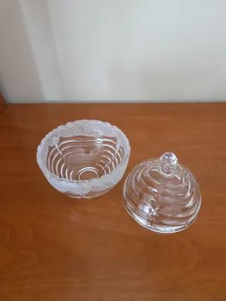 Elegante bombonera de cristal con un diseño tallado. - Material: Cristal. - Decoración: Flores y hojas grabadas en la base. - Tapa con asa.
