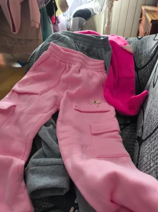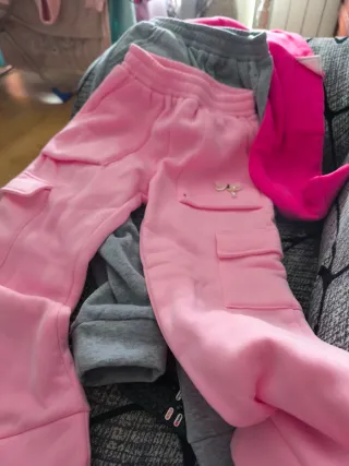 Conjunto de ropa para niña de 7 a 8 años. - Pantalones de chándal color rosa con bolsillos cargo. - Pantalones de chándal color gris. - Detalle de mariposa en uno de los pantalones rosas.