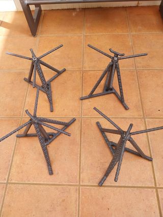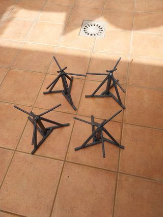 Se venden cuatro soportes resistentes para caravanas. Son ideales para levantar y estabilizar caravanas. - Fabricados con metal resistente. - Diseño triangular para mayor estabilidad. - Fáciles de usar. - Perfectos para trabajos de mantenimiento o reparación.