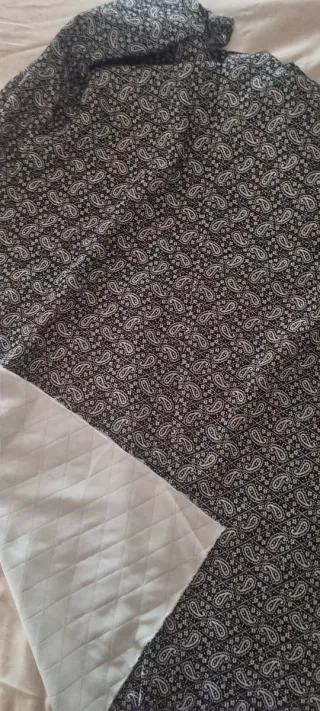 Tejido con estampado de cachemir en tonos blanco y negro. El reverso es de color blanco y está acolchado con un patrón de rombos. Es muy ligero y cálido pesa muy poco. Mira mi perfil puede haber algo que te interese y todo muy económico. Te puedo hacer lote y descuento. - Diseño: Cachemir. - Reverso acolchado.