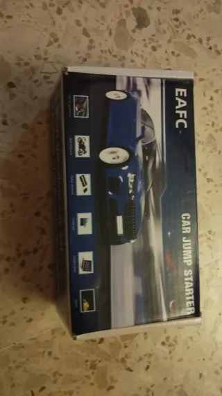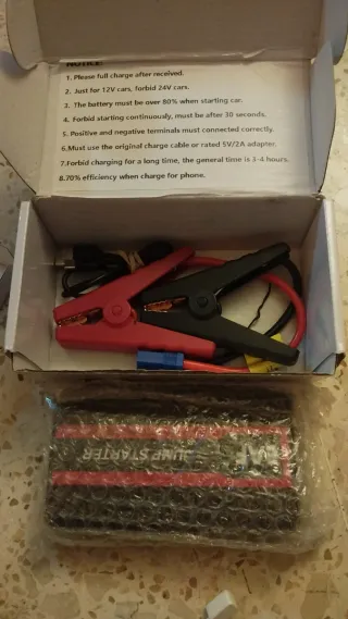 Arrancador de coche portátil para vehículos de 12V. Incluye pinzas rojas y negras, cable de carga y adaptador. - Carga completa recomendada antes del primer uso. - No apto para vehículos de 24V. - La batería debe estar al 80% para arrancar el coche. - Evitar arranques continuos; esperar 30 segundos entre intentos. - Conectar los terminales positivo y negativo correctamente. - Utilizar el cable de carga original o un adaptador de 5V/2A. - Tiempo de carga general: 3-4 horas. - Eficiencia del 70% al cargar un teléfono.