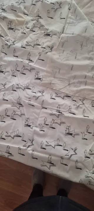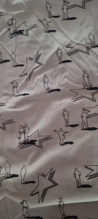 Tejido blanco con un diseño original de figuras humanas y estrellas en negro. Muy suave. Ideal para proyectos de costura o decoración. - Medidas: 1,50 x 2,20 metros. - Estampado: Figuras humanas y estrellas. - Color: Blanco con estampado negro.