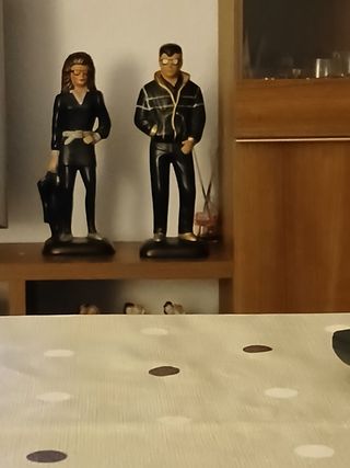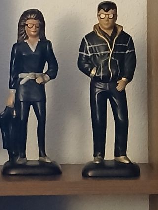 Conjunto de dos figuras decorativas. - Figura femenina con traje negro y cinturón blanco. - Figura masculina con chaqueta negra y detalles dorados. - Ambas figuras llevan gafas de sol y zapatos dorados. - Base negra para cada figura.Están pintadas a mano