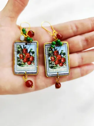 Pendientes únicos con diseño inspirado en sellos postales italianos. Detalle de racimo de frutas rojas. - Cuentas de cristal en tonos verdes y rojos. - Cierre de anzuelo dorado.