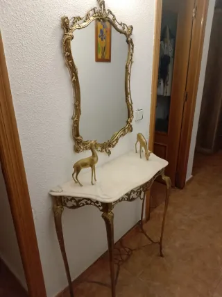 Elegante consola de entrada con un precioso espejo. - Estructura metálica dorada con detalles ornamentales. - Encimera de mármol. - Incluye dos figuras decorativas de ciervos dorados.