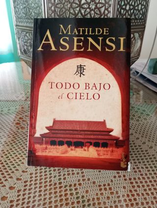 Novela aventuras" Todo bajo el cielo"de Matilde Asensi, editorial Booket 2006. Cubierta semirrígida, letra bastante grande, cómoda para leer. Está dedicado por la autora, durante una Feria del Libro. Elvira parte en barco de Marsella a Shanghai para recuperar el cadáver de su marido, que falleció allí. Junto con su sobrina, se verá inmersa en una aventura por China en busca del tesoro del primer emperador.