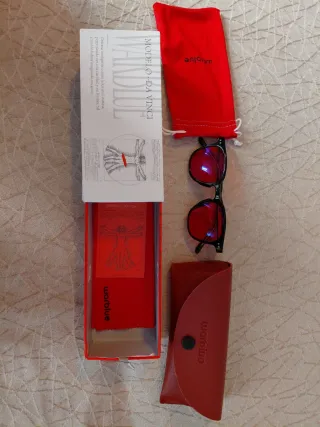 Segunda unidad a 30 euros (oferta unica) Valoradas por mas de 150 euros. Gafas de la marca Warblue, modelo Da Vinci, con lentes rojas. Dimension para adolescentes y adultos para cuando estan en las pantallas y ordenadores jugando y estudiando pues estas gafas bloquean la luz azul dañina y mejora la calidad de sueño - Montura negra. - Incluye funda protectora de cuero marrón. - Incluye bolsa de tela naranja. -Uso: Principalmente para uso nocturno o ante pantallas, diseñadas para bloquear la estimulación circadiana. - Son gafas diseñadas para bloquear el espectro de luz azul/verde (100% bloqueo), promoviendo la producción de melato