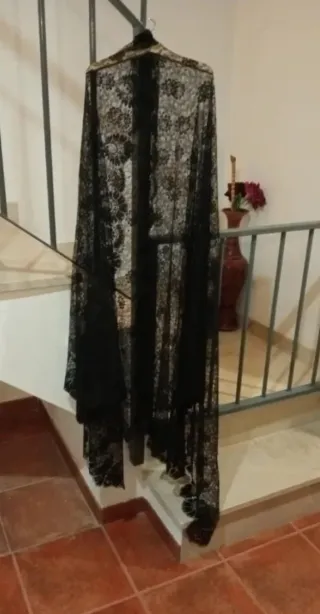 Mantilla de encaje negra con un diseño floral. El único que ha tenido fue para prueba de peinado. - Medidas: 120 cm x 250 cm. - Color: Negro. - Diseño: Encaje floral.
