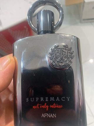 Perfume AFNAN Supremacy Not Only Intense. - Envase de cristal plateado. - Tapa metálica con aro. - Detalle de escudo con inscripción. - Texto Supremacy not only intense en rojo. - Marca AFNAN en la base.