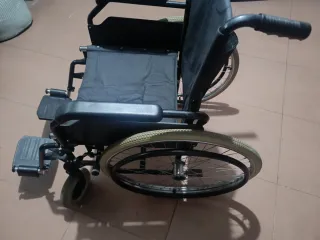 Silla de ruedas funcional y fácil de transportar. - Asiento y respaldo de tela negra. - Ruedas traseras grandes y ruedas delanteras pequeñas. - Reposapiés. - Reposabrazos.