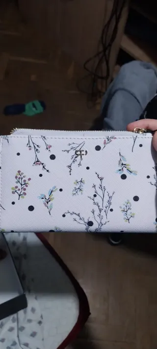Elegante cartera con un delicado estampado floral sobre fondo blanco. Perfecta para llevar tus esenciales. - Diseño con flores y puntos. - Cierre de cremallera dorada. - Pequeño logo metálico en la parte frontal.