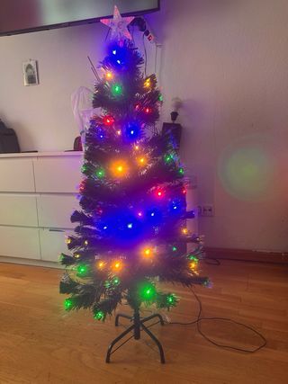 Árbol de Navidad artificial decorado con luces LED de colores y una estrella en la punta. - Luces LED multicolores. - Estrella decorativa en la cima. - Base de soporte incluida.