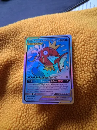 Vendo una de las cartas más exclusivas de Pokémon: Magikarp & Wailord GX Alternate Art (#161/181). Estado: Usada (Lightly Played). El frente está muy bien, el reverso tiene marcas blancas en los bordes y esquinas (ver fotos). Originalidad: 100% original con textura y relieve al tacto. Idioma: Inglés. (Escucho ofertas razonables, aunque esta demasiado por debajo del precio LP). Aunque al igual es algo negociable