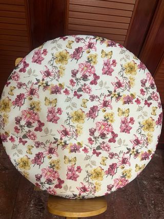 Mundillo redondo con un estampado floral vibrante y mariposas. La tela es completamente nueva. - Medidas: 60x60 cm. - Diseño: Flores y mariposas. - Material: Tela nueva a estrenar.