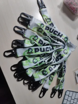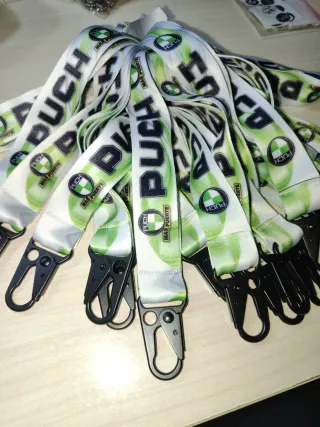 Llavero con el logo de PUCH y el lema MAS FUERTE. - Diseño blanco con detalles en verde. - Cierre de mosquetón metálico negro de alta calidad. Precio unitario